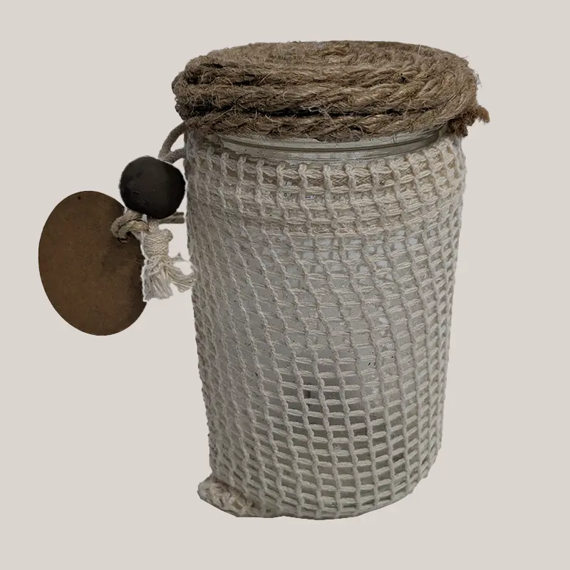 Bote de vidrio con una luz interior decorada con cuerda de cañamo y bolsita de algodón.