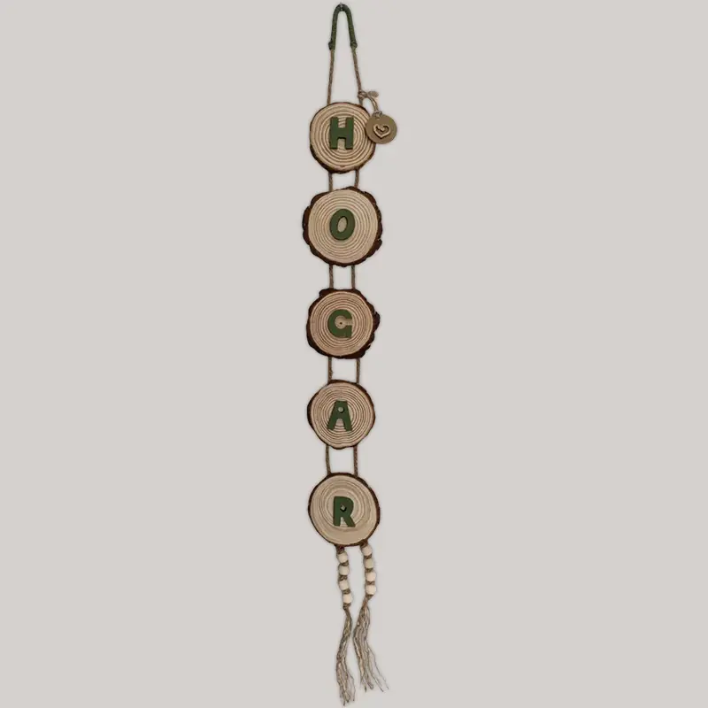 Colgante «hogar» decorado con cuerda, rodajas de madera, cuentas de madera, y pintura a la tiza.