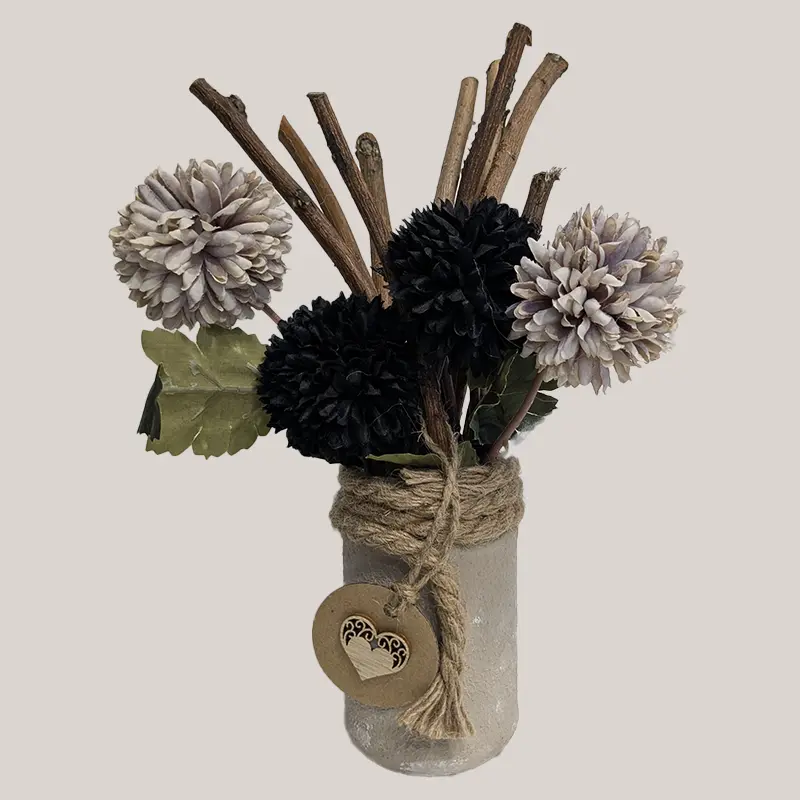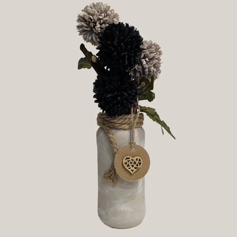 Envase de vidrio decorado con pintura a la tiza. Cuerda de cañamo y flores artificiales.