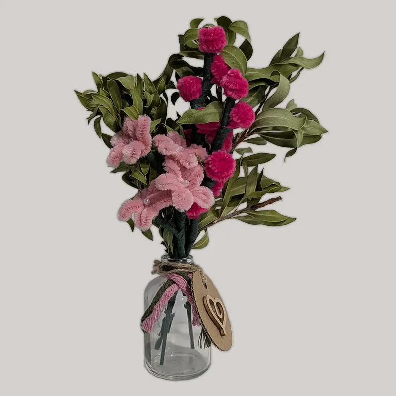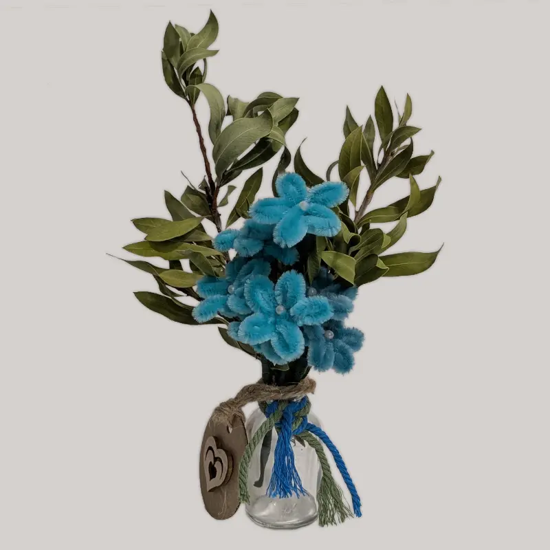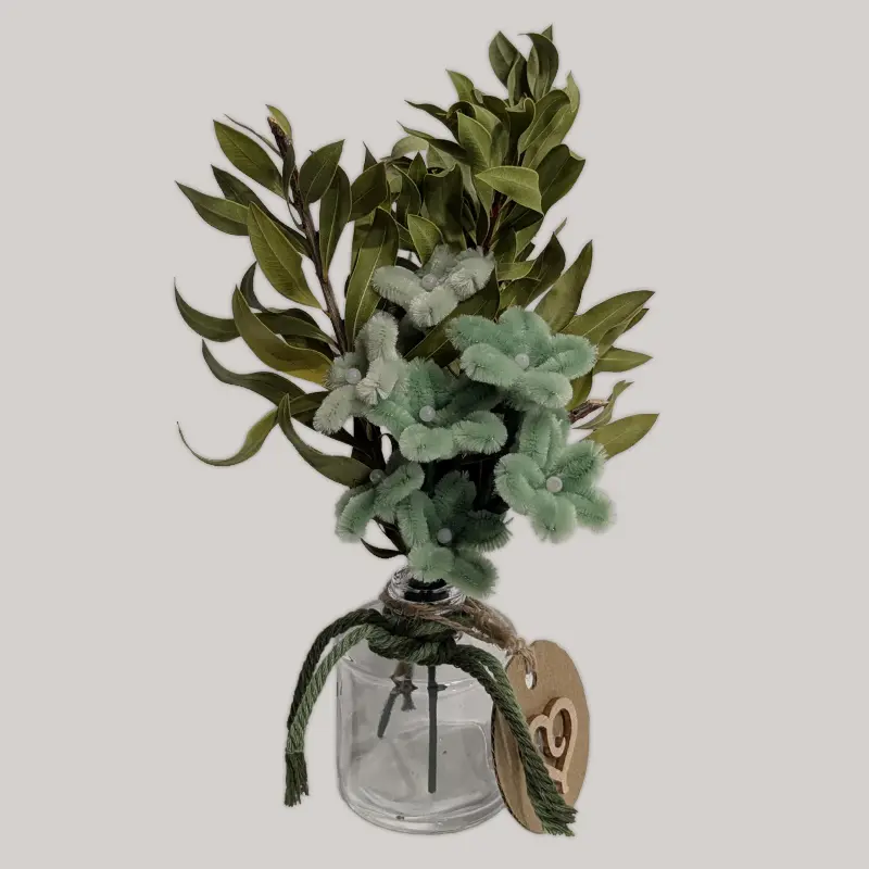 Envase de vidrio con flores artificiales y cuerda de algodón.
